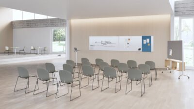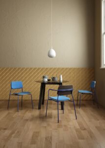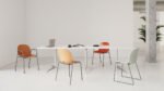 It is available in different frames: 4 metal legs, sled, 4 wood legs and swivel four-star base with castors.